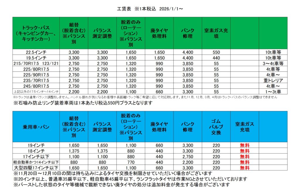 ※通常トラックはバランス調整をしませんがご希望の場合は1本税込み22.5~19.5インチ3300円、17.5インチ2750円、16インチ以下2200円となります。トラック・バスのバランス調整は11月、12月、3月、4月は実施しておりません